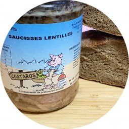 Lentilles 25%, saucisses 42,5% (maigre et gras de porc (origine FRANCE),sel, poivre, ail, antioxydant : ascorbate de sodium,dextrose,huile de tournesol oléique), fond de veau (arômes-amidon modifié-sel-fécule de pomme de terre-saccharose-graisse de boeuf et de viande de veau (5%)-tomate-extrait de vin blanc-acidifiants:E270, E296 et E32-antiagglomérant :E504i-colorant : E150c-plante aromatique-huile de tournesol oléique), lardons (origine france) , farine (GLUTEN), oignons, carottes, laurier, herbes de Provence.