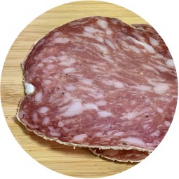 Maigre de porc (73%), gras de porc (22%) origine FRANCE, assaisonnement (5%) : sel, poivre, ail, Glutoni (LACTOSE, sel, dextrose, sirop de glucose, conservateurs : E252, saccharose), ferments, boyaux naturels de porc.